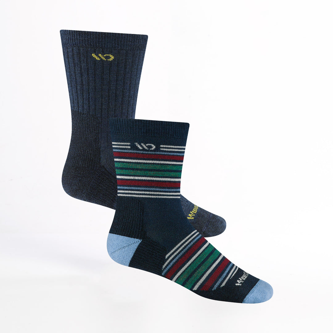On model side shot of Micro Crew socks with blue heel/toe and Cream logo, Navy body and red and green  stripes.