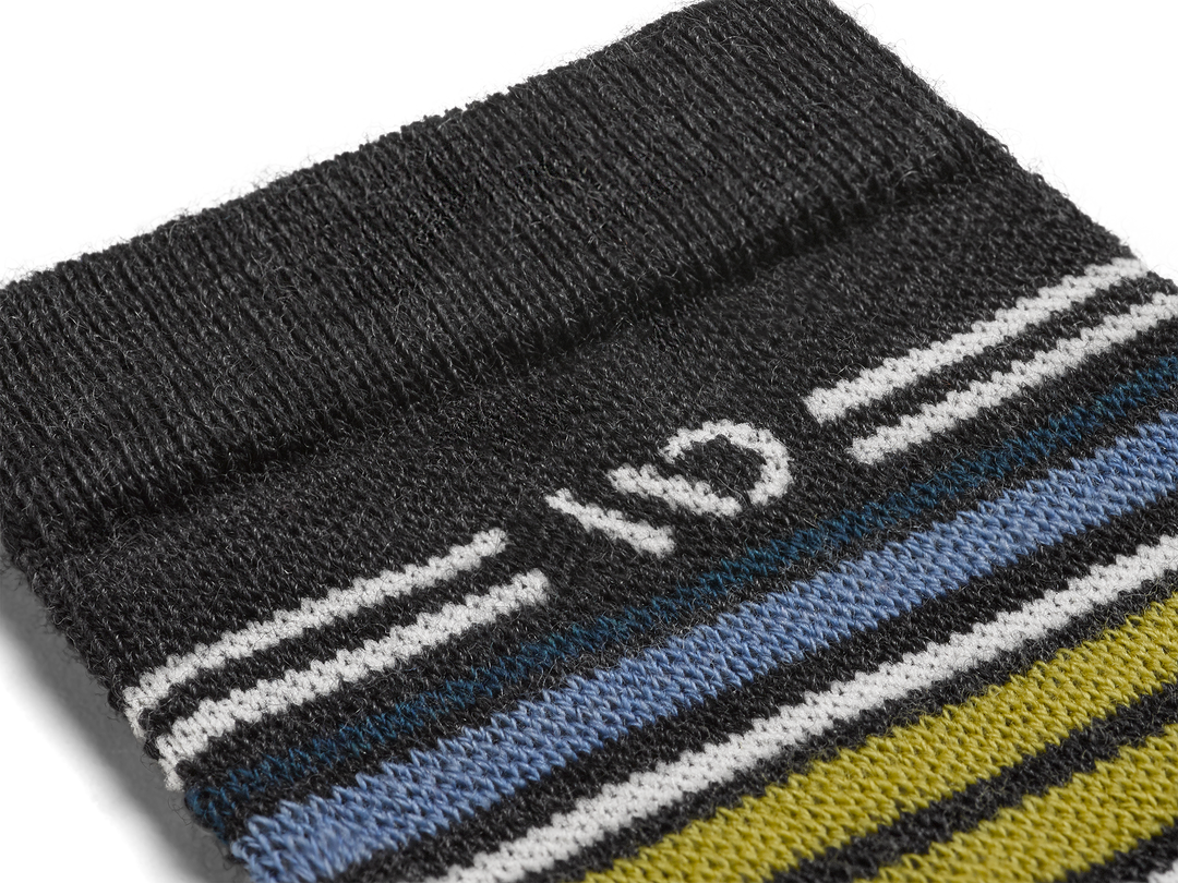 On model shot of Micro Crew socks with teal heel/toe and Cream logo, Charcoal body and blue and yellow  stripes.