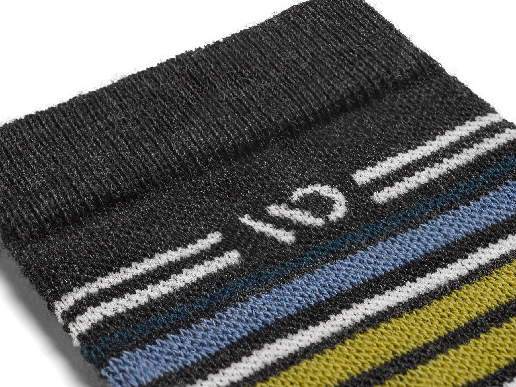 Detail featuring white, yellow, blue and teal stripes around the cuff--Charcoal