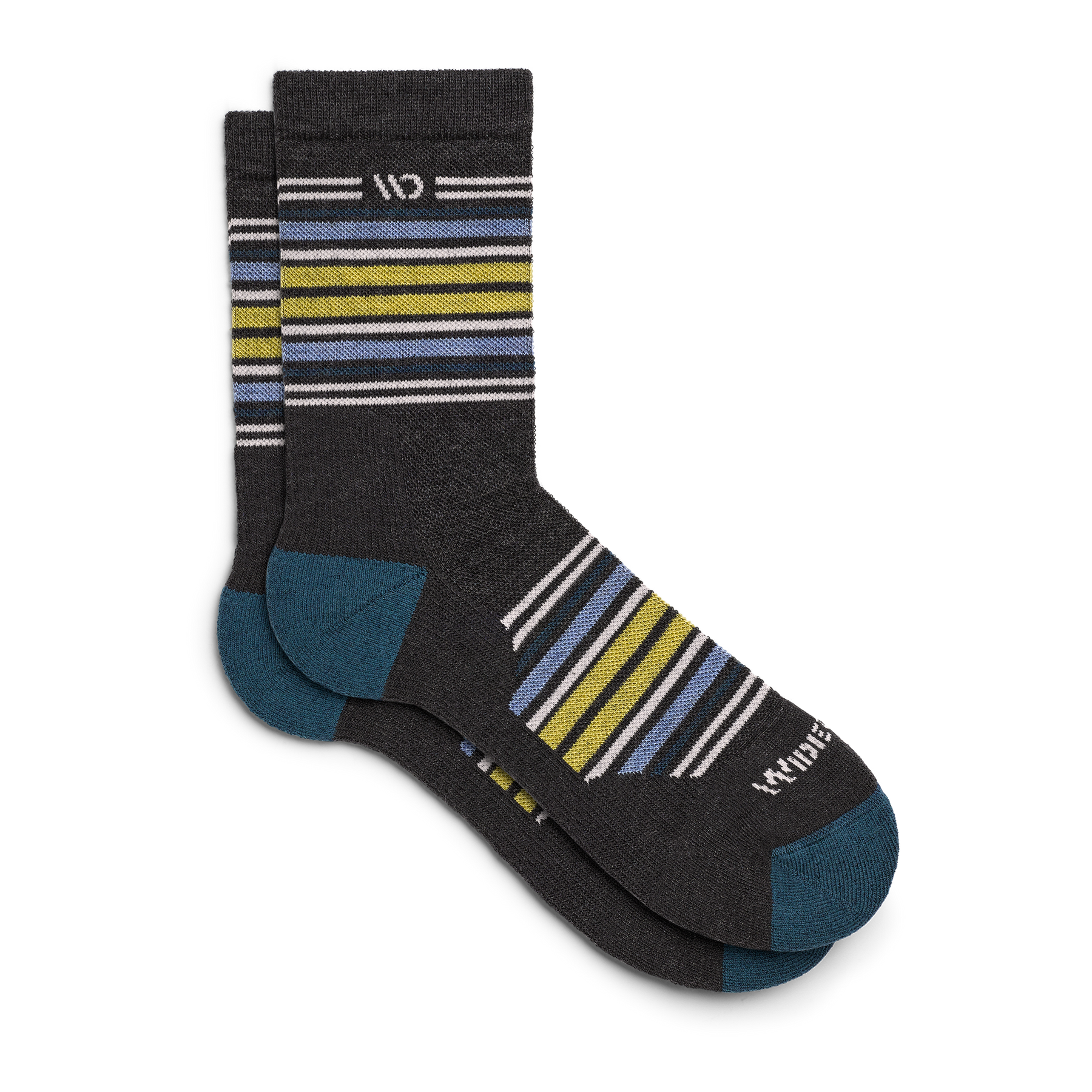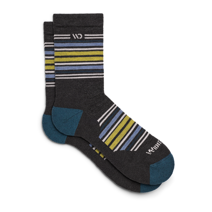 On model side shot of Micro Crew socks with teal heel/toe and Cream logo, Charcoal body and blue and yellow stripes.