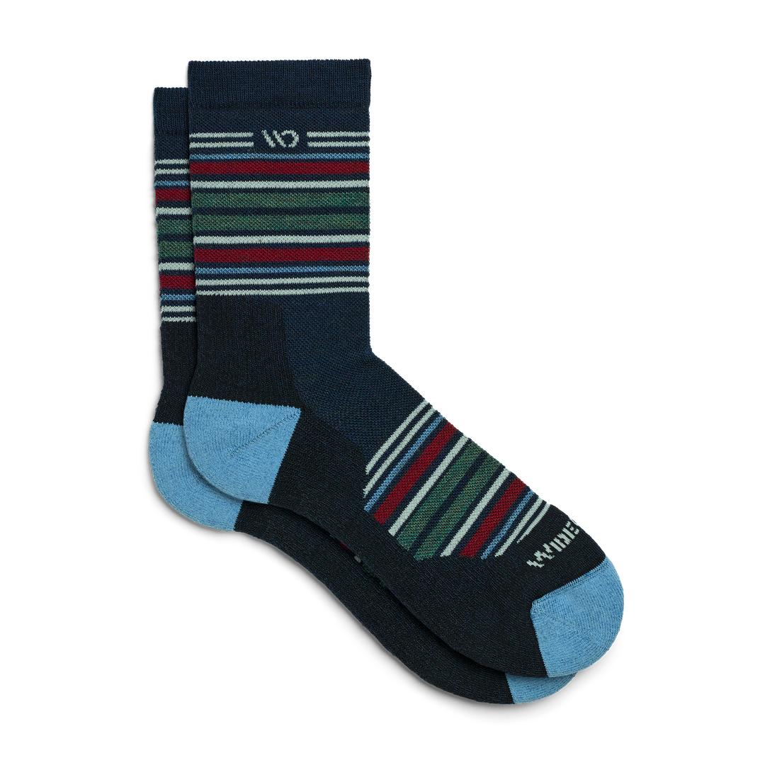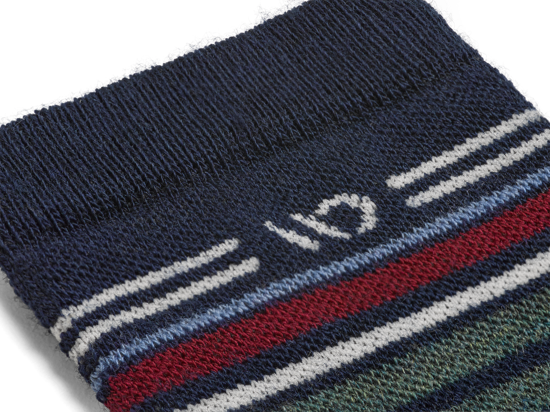 On body Micro Crew sock with Blue heel/toe and Cream logo, Navy body and red and green  stripes.