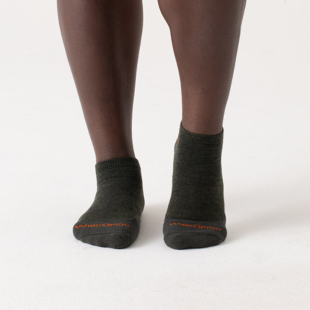 on model image with one foot to the side wearing the 9000 solid no show in spruce
