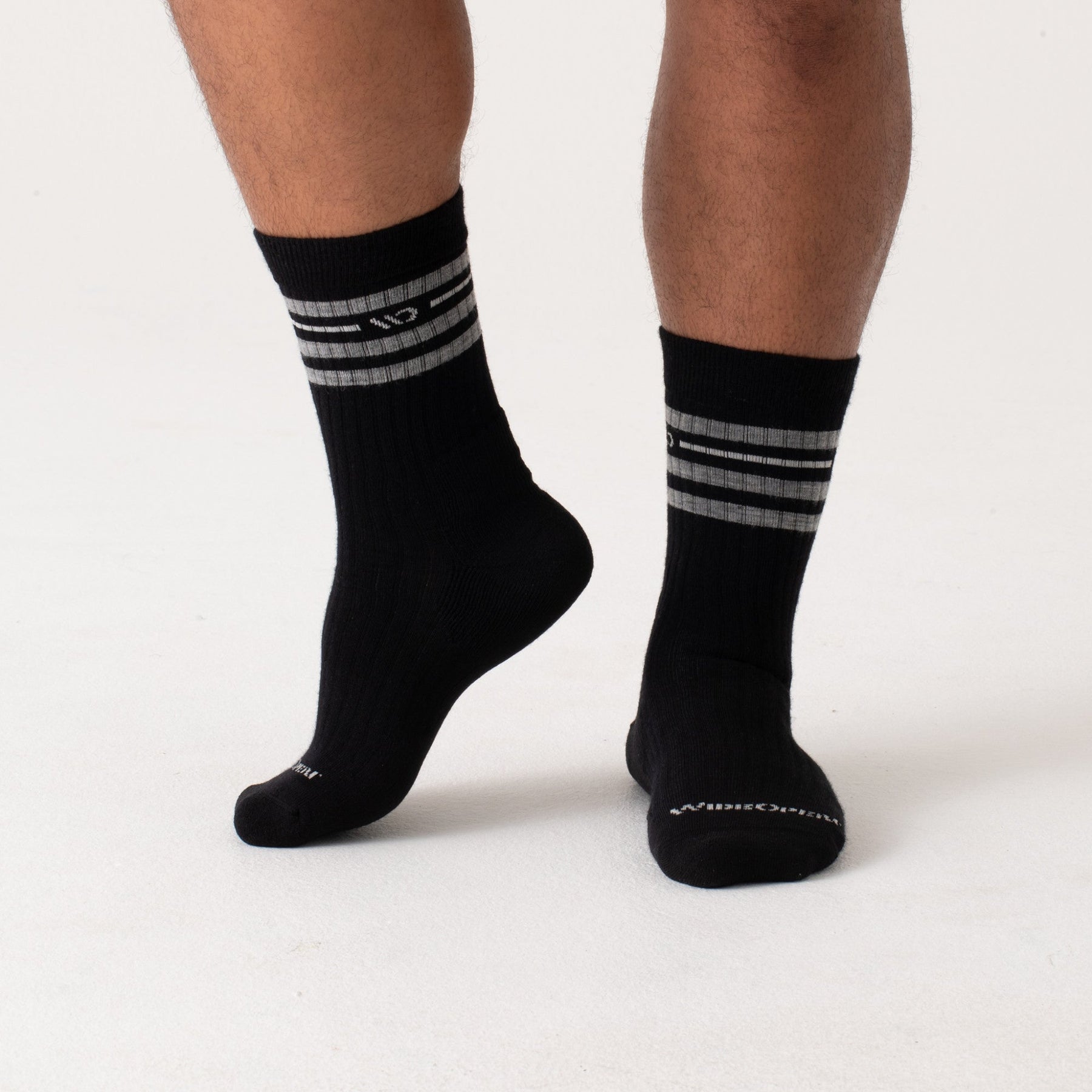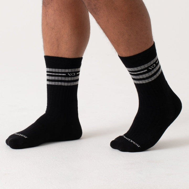 On model of the Black Crew with white logo, black body and gray stripes under cuff --Black