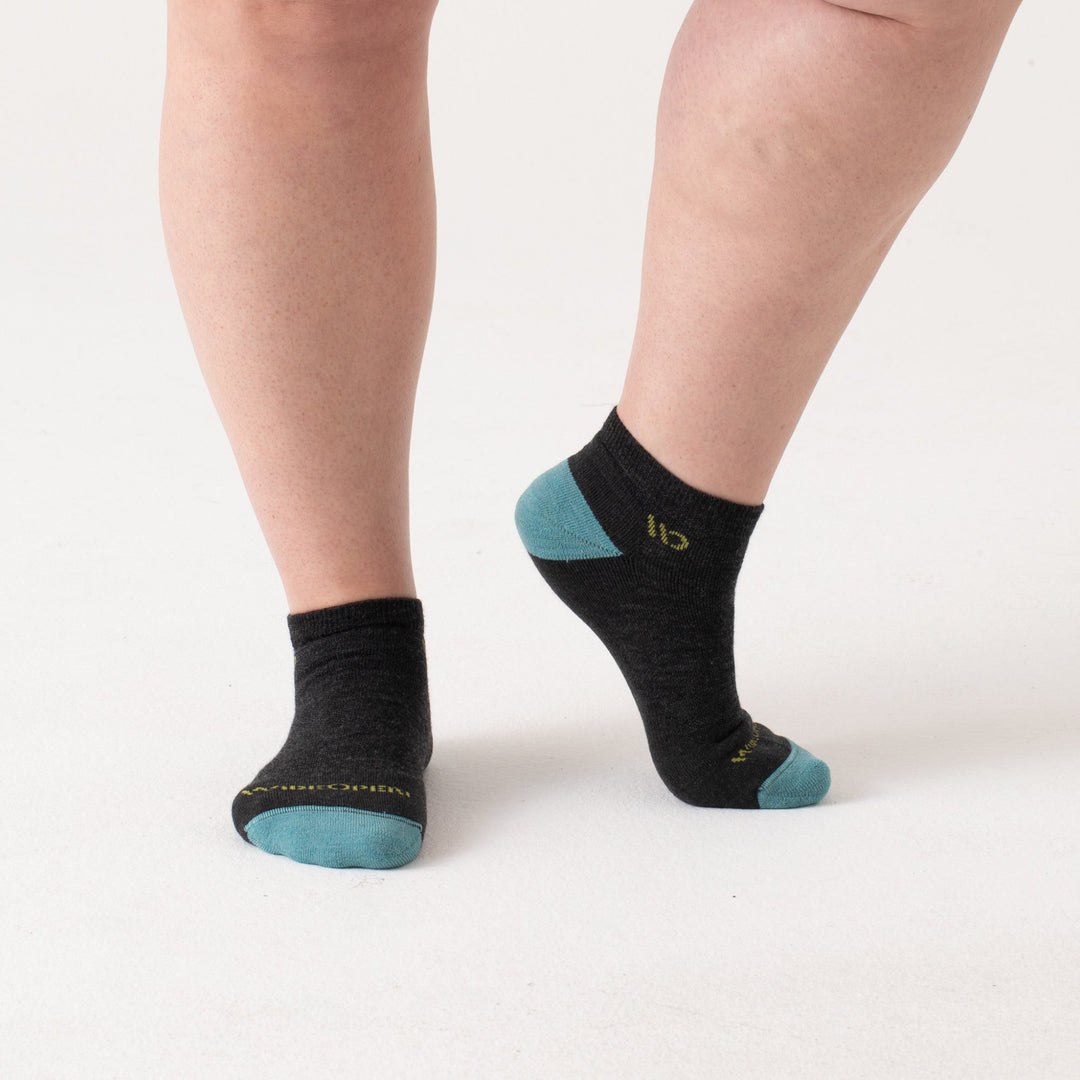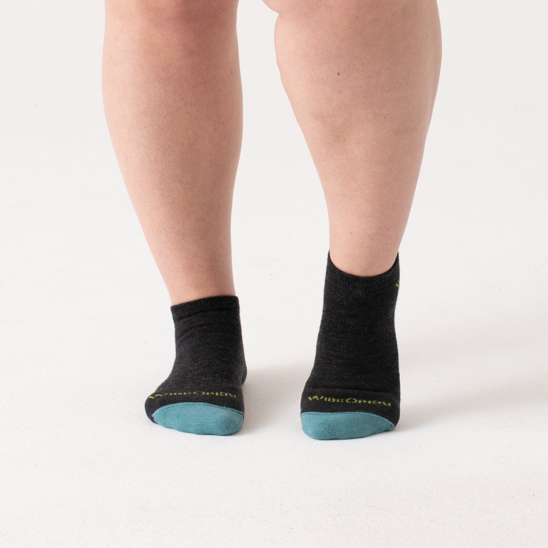 On model: No shows with aqua heel/toe and yellow logo, with charcoal body --Charcoal