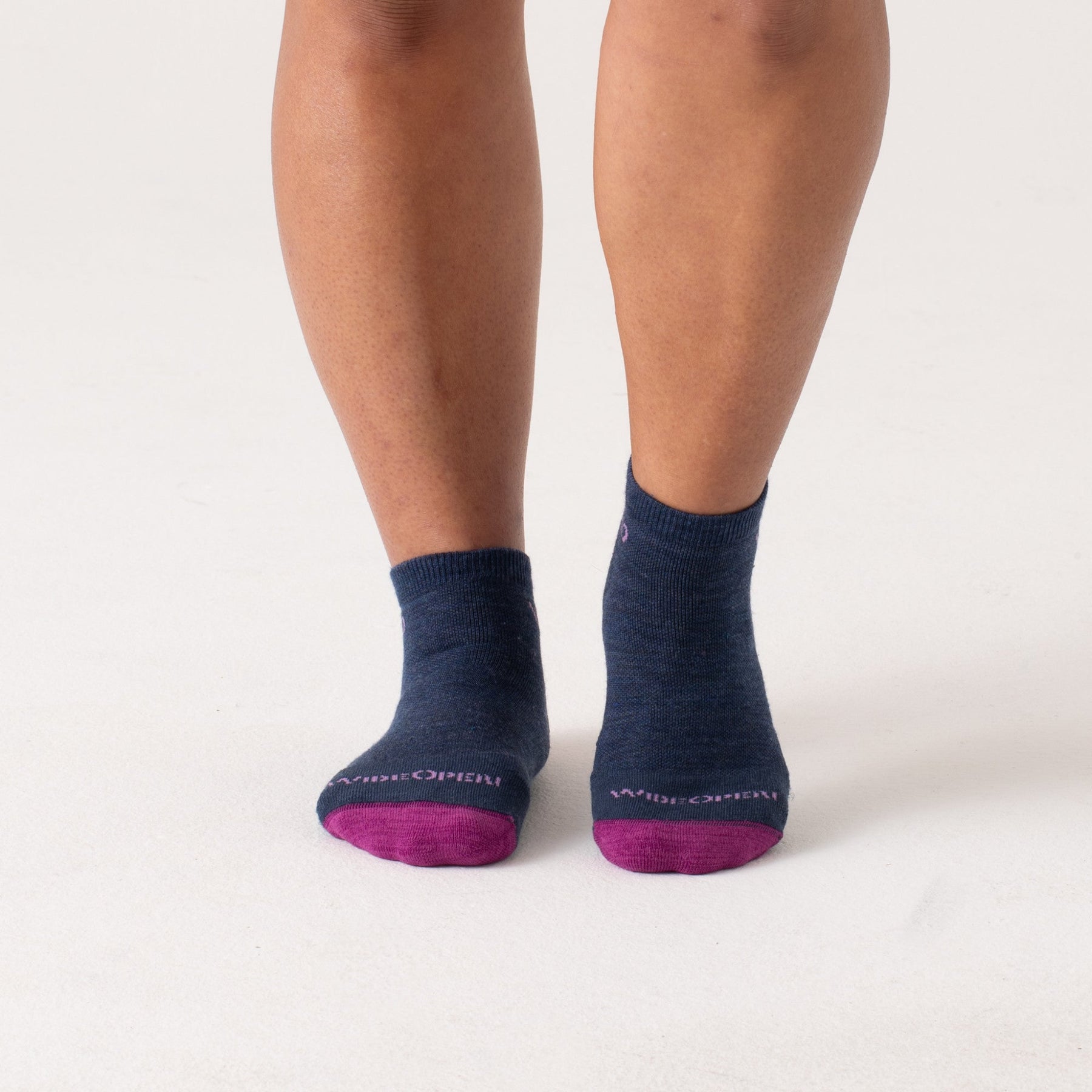 on model image with feet crossed wearing the 9500 solid no show in violet