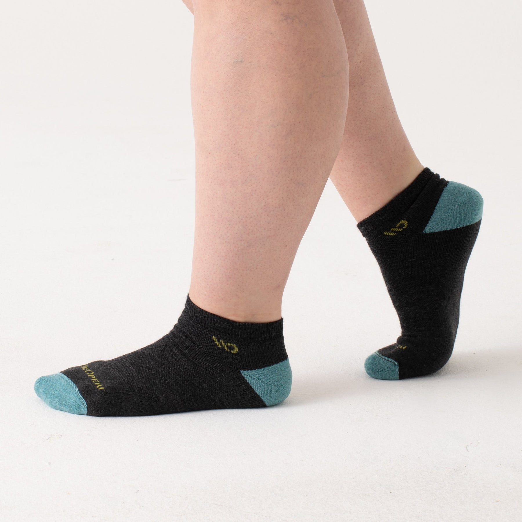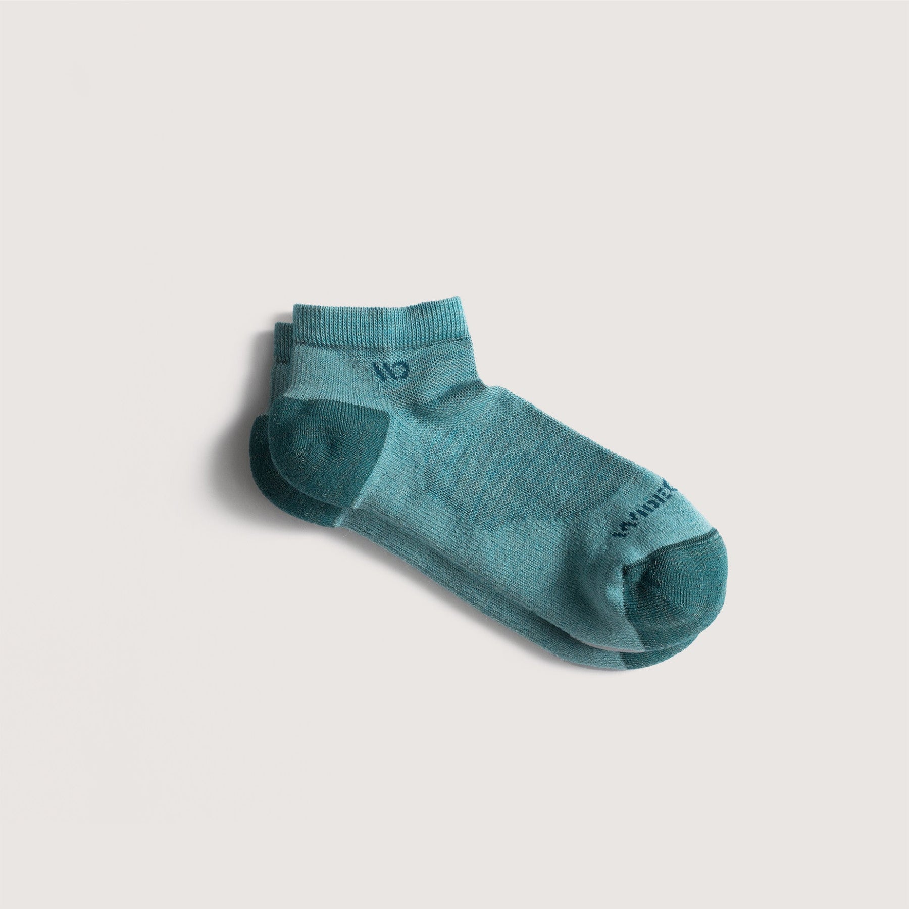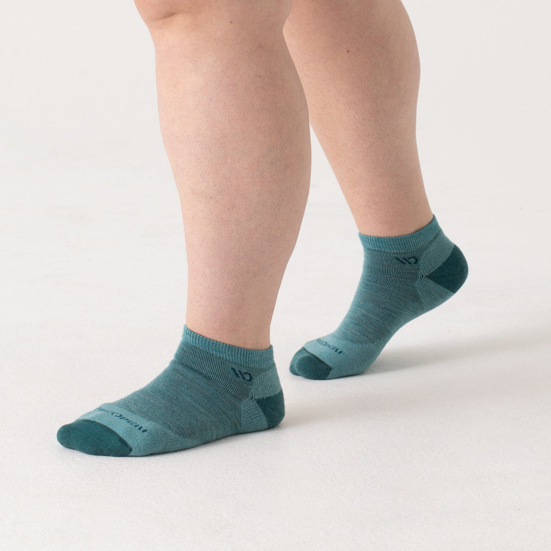 On model: No shows with dark teal heel/toe and logo, with light teal body --Light Teal