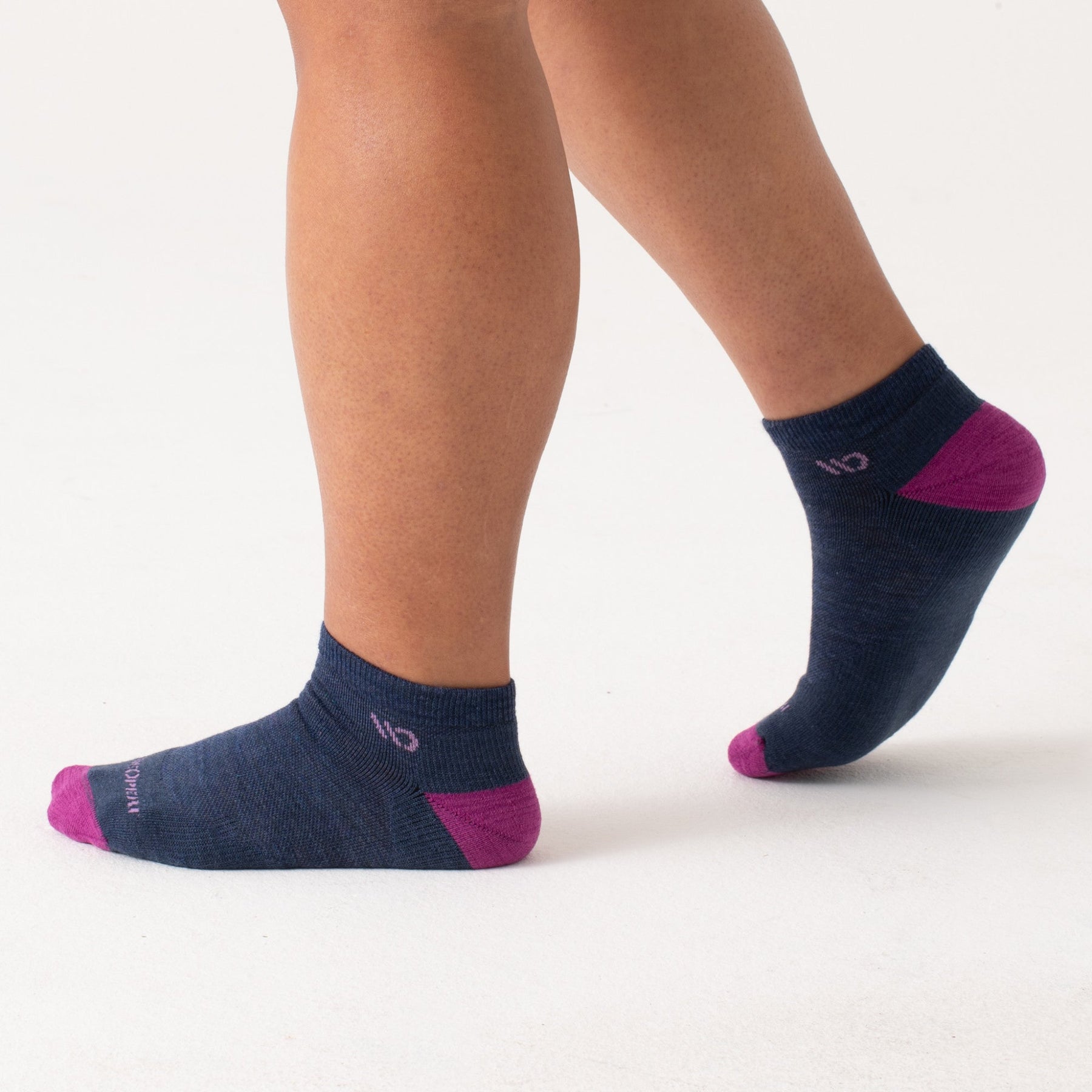 On model: No shows with fuschia heel/toe and lavender logo, with denim body --Light Teal/Denim/Taupe