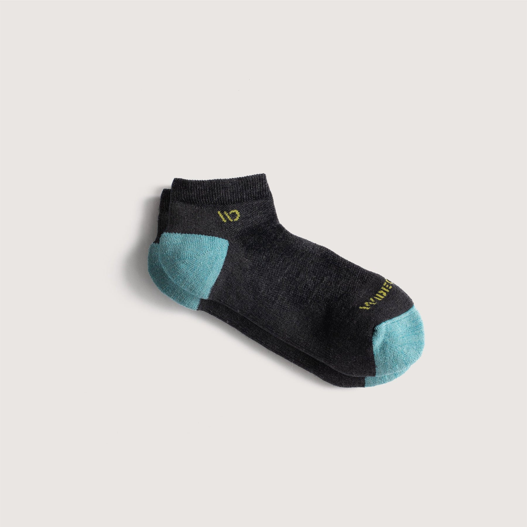 Flat socks featuring aqua heel/toe, yellow logo, and charcoal body --Charcoal